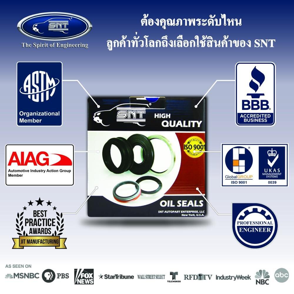 ● วัสดุ : เหล็ก SPCC + ยาง NBR (ASTM Standard) ● อุณหภูมิใช้งาน : -30°C ~ 100°C / -22°F ~ 212°F ● อายุการเก็บผลิตภัณฑ์ : 5 - 10 ปี ● การรับประกัน : 1 ปี ( ในกรณีที่เกิดความผิดพลาดจากการผลิต ) -------------------------------------------------------- 🔘 คุณภาพระดับไหน ที่ทำให้ลูกค้าทั่วโลกเลือกใช้สินค้าของ SNT -------------------------------------------------------- ↗ มาตรฐาน ISO 9001: 2008, ISO 9001: 2015 ▶SNT ผ่านการตรวจสอบกระบวนการผลิตและคุณภาพที่เข้มงวด โดยได้รับการรับรอง ISO 9001 : 2015 ที่ครอบคลุมระบบการจัดการคุณภาพทั้งทั้งระบบ จากสถาบัน UKAS (ประเทศอังกฤษ)