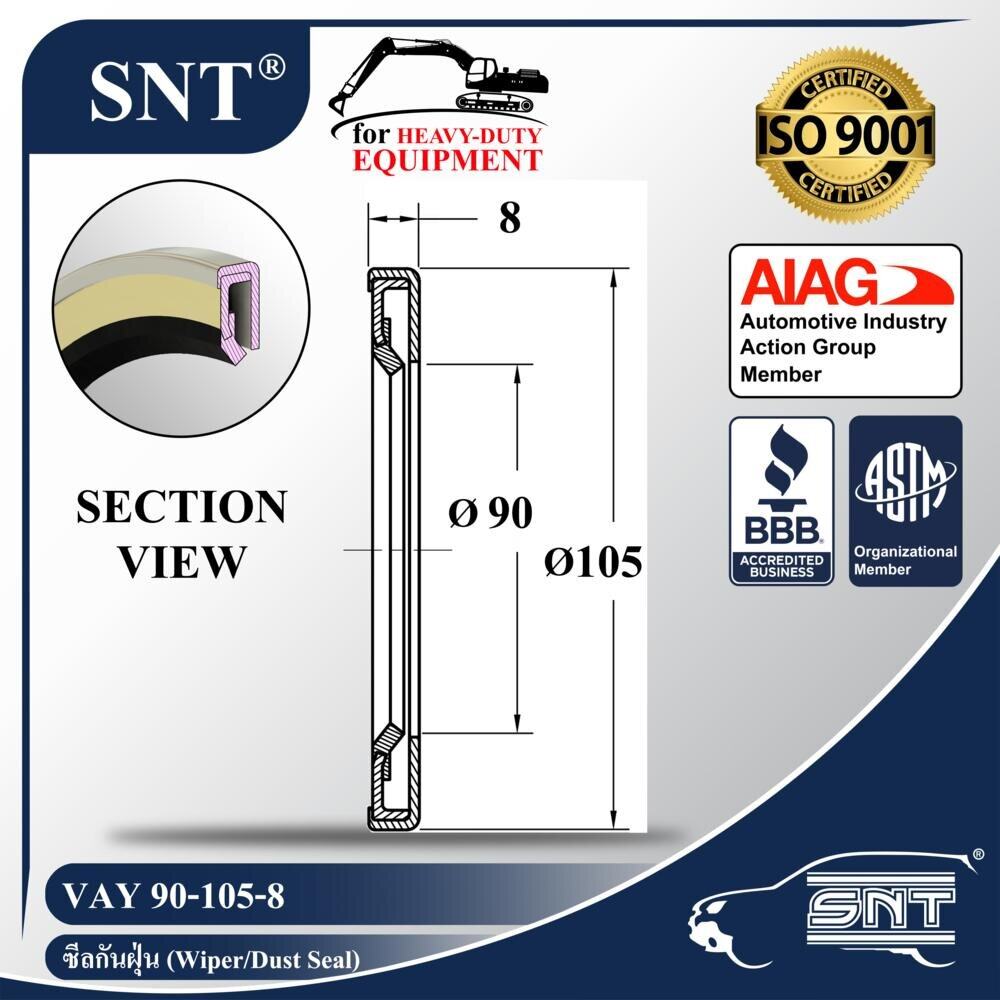 ● ชื่อสินค้า : VAY 90-105-8 - Wiper Seal / Dust Seal / Pin Dust Seal ( ซีลกันฝุ่น ) ● แบรนด์ : SNT (USA Trademark) ● มาตรฐานคุณภาพ : ISO 9001, ASTM (American Society for Testing and Materials), AIAG (Automotive Industry Action Group) ● OEM / Replacement Part No. : VAY 90-105-8, VAY90-105-8 ● รถ/รุ่น : - ● ขนาด VAY 90 x 105 x 8 . เส้นผ่านศูนย์กลางภายนอก : 105 mm. . เส้นผ่านศูนย์กลางภายใน : 90 mm. . สูง1 : 8 mm.
